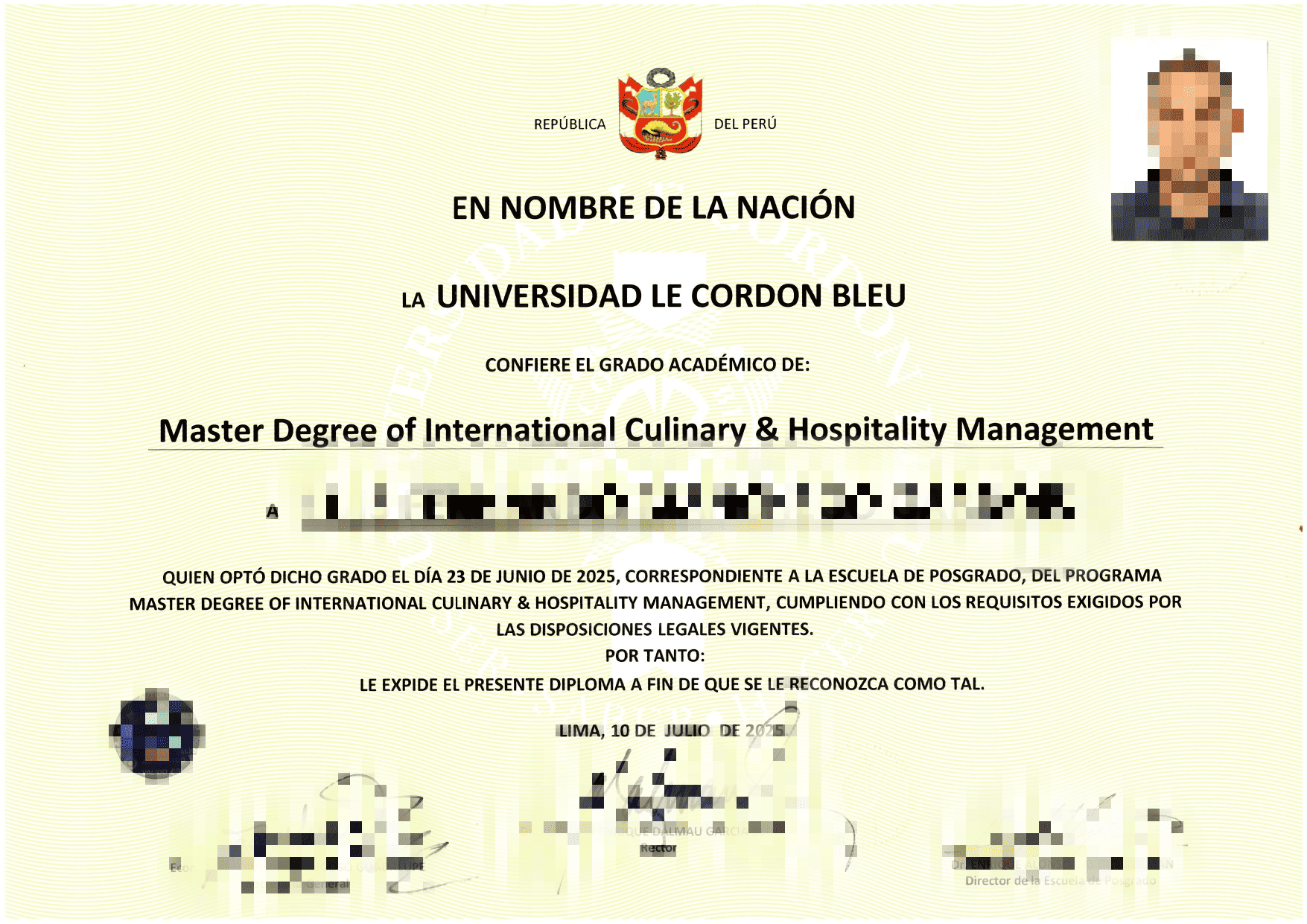 Luego de otorgado el grado académico, se otorgará adicionalmente el Diploma Internacional de “Master Degree of International Hospitality Management” emitido por la Fondation Le Cordon Bleu- Art Culinaire Et Gestion Hoteliere.